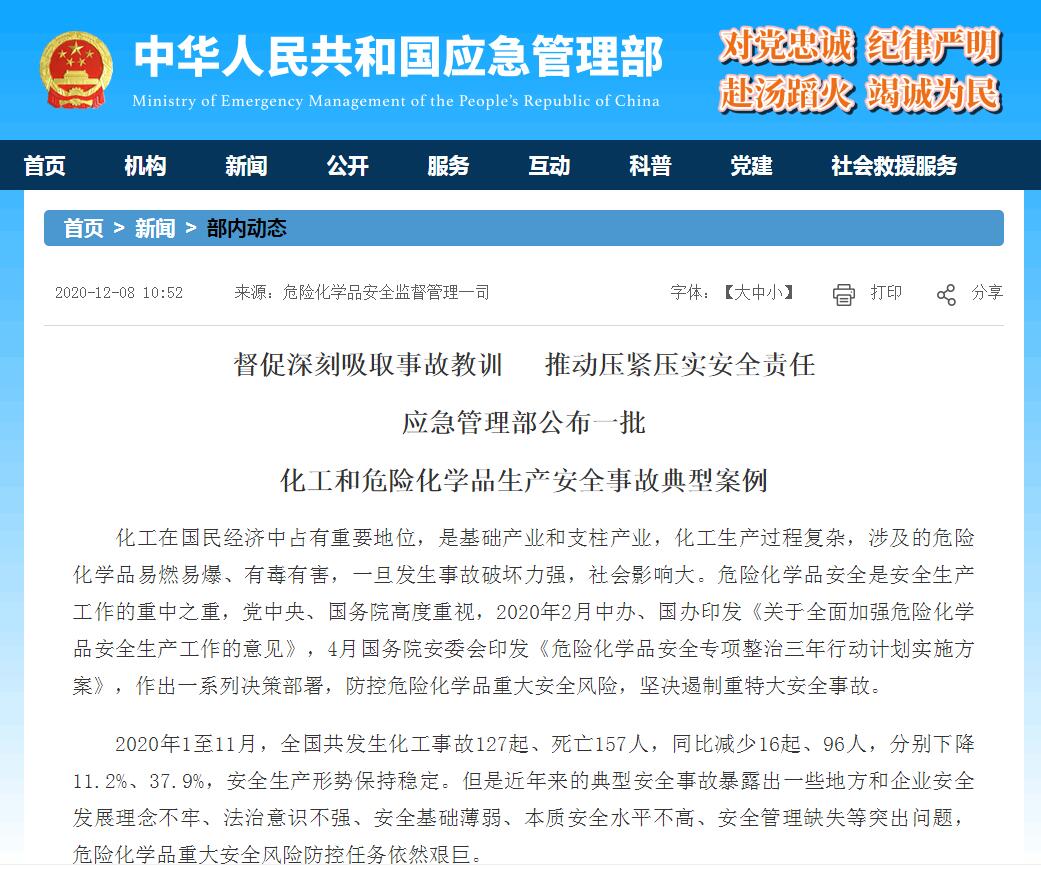 應(yīng)急管理部指出,化工在國民經(jīng)濟(jì)中占有重要地位,是基礎(chǔ)產(chǎn)業(yè)和支柱產(chǎn)業(yè),化工生產(chǎn)過程復(fù)雜,涉及的危險化學(xué)品易燃易爆、有毒有害,一旦發(fā)生事故破壞力強(qiáng),社會影響大。危險化學(xué)品安全是安全生產(chǎn)工作的重中之重,但是近年來的典型安全事故暴露出一些地方和企業(yè)安全發(fā)展理念不牢、法治意識不強(qiáng)、安全基礎(chǔ)薄弱、本質(zhì)安全水平不高、安全管理缺失等突出問題,危險化學(xué)品重大安全風(fēng)險防控任務(wù)依然艱巨。