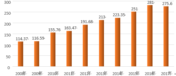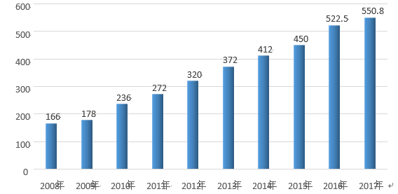 (2008年到2017年國(guó)內(nèi)聚醚多元醇產(chǎn)能統(tǒng)計(jì),單位萬(wàn)噸)
